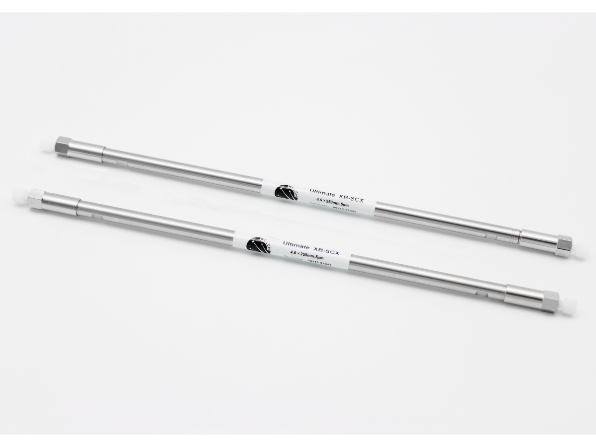 Ultimate SCX色谱柱采用硅胶基质,以芳香族磺酸基为键合相,制成的一种典型的阳离子交换柱。通常用于碱性、水溶的化合物的分离。特殊应用包括有机碱如碱性氨基酸、苯胺、药用盐和核苷酸等。