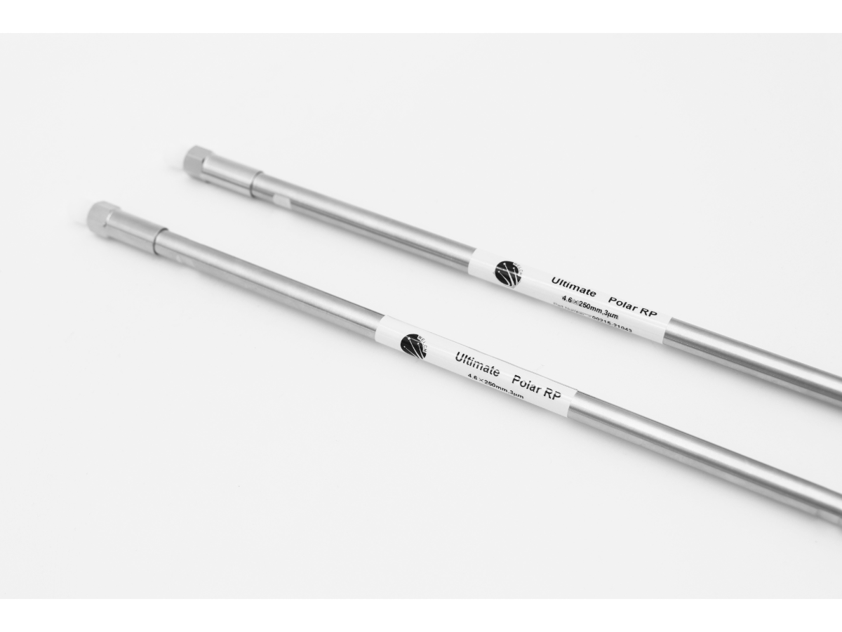 Ultimate Polar RP通过极性基团的引入,双峰尾工艺,更大程度上的覆盖了硅胶表面的裸露羟基,更适合极性较大的化合物的保留,也有利于改善碱性化合物的峰形。由于键合相表面引入了极性基团,一方面提高了键合相对于纯水相的耐受能力,另一方面也可为分析工作者提供一种不一样的保留机理。