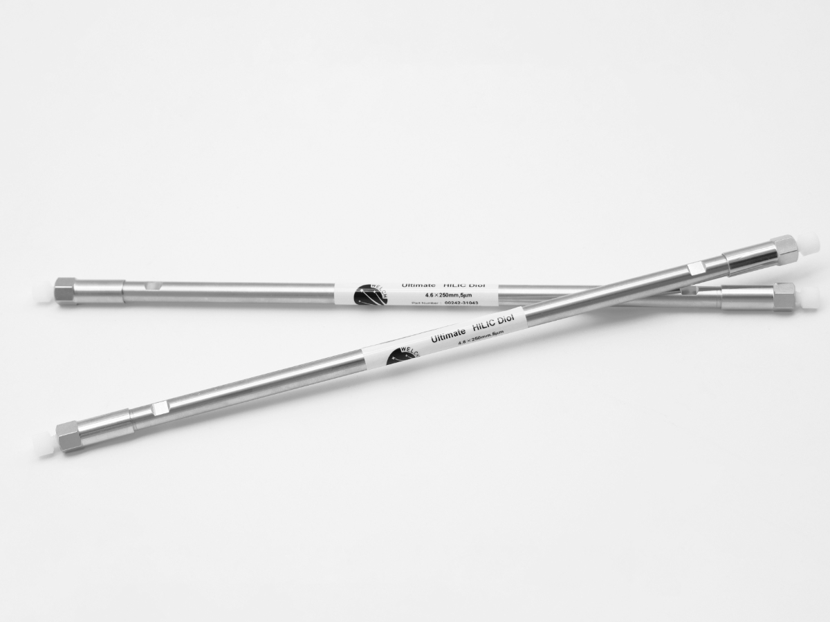 Ultimate HILIC-Diol(二醇基)液相色谱柱,其固定相是以超纯全多孔球形硅胶为基质,通过采用月旭公司独有的固定相键合技术,使用含有1,2-二羟基丙基官能团的有机硅烷键合而成。该色谱柱适用于大多数正相色谱的应用,还可以作为HILIC亲水作用色谱的固定相,用于多肽、蛋白质以及极性药物分子等的分离,也适用于有机酸及其多聚物的分离。