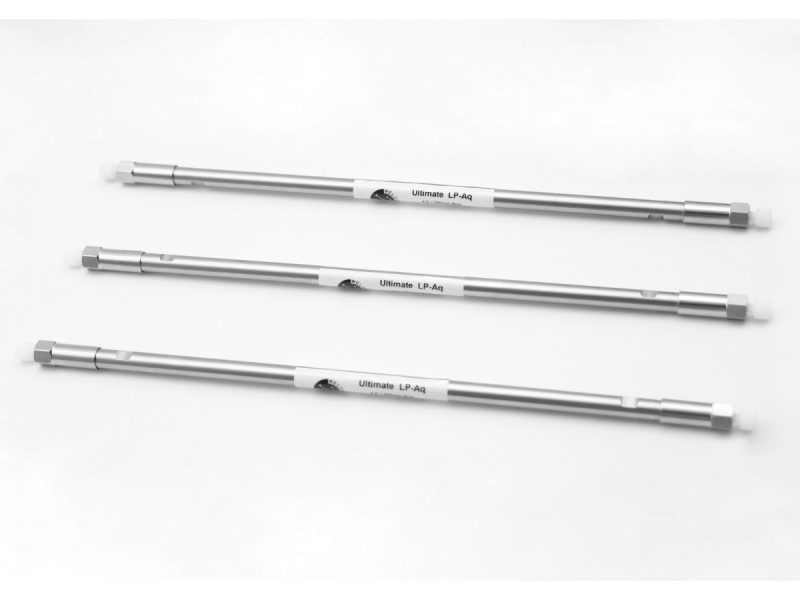 Ultimate LP-AQ色谱柱是一款能够耐受100%水相的色谱柱,同时能耐受强酸条件,在低pH值下仍然能保证固定相的稳定性,采用了极性封尾,具有与LP-C18不一样的选择性。